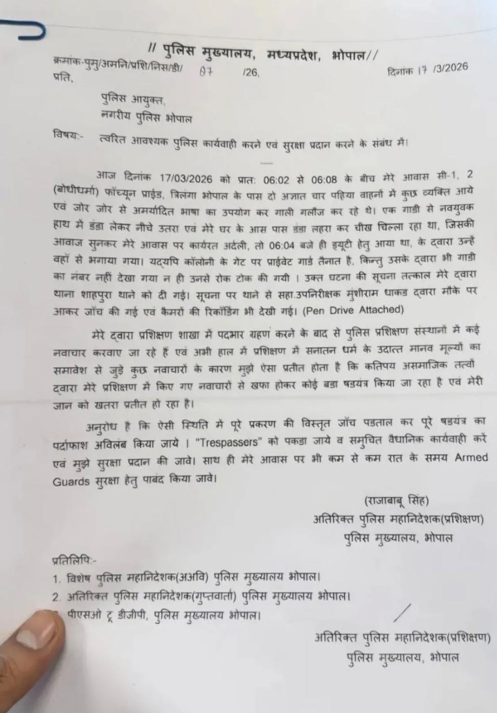 Bhagesh pawarમધ્યપ્રદેશ પોલીસના ADG (તાલીમ) રાજાબાબુ સિંહને અજાણ્યા યુવાનોએ ધમકી આપી હોવાનો મામલો સામે આવ્યો છે. બુધવારે, ADG રાજાબાબુએ પોલીસ કમિશનર અને DGPને પત્ર લખીને સુરક્ષા વધારવાની વિનંતી કરી હતી. તેમણે પત્રમાં તેમના જીવને જોખમ હોવાનો પણ ઉલ્લેખ કર્યો હતો. જોકે, ફરિયાદના થોડા કલાકોમાં જ પોલીસે આરોપીની ધરપકડ કરી લીધી હતી.